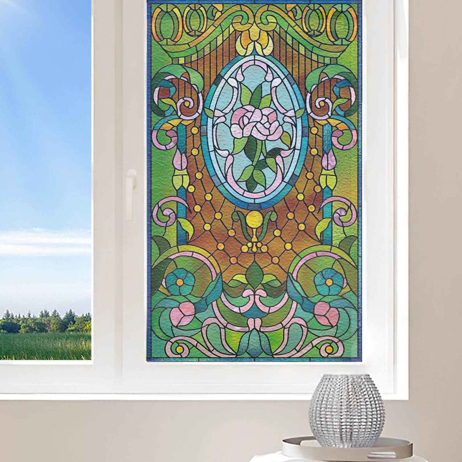 Film electrostatique décoratif florale Art déco pour fenêtre, vitre et surfaces lisses.