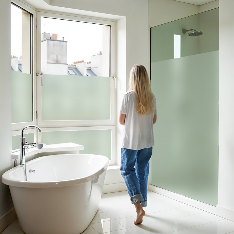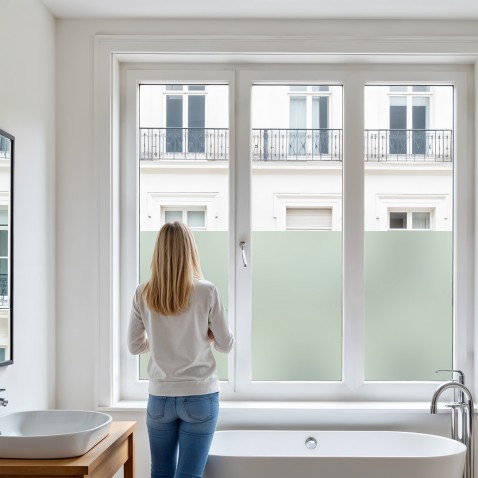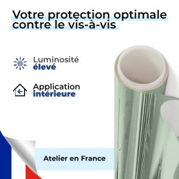 Film depoli opaque Vert. Brise-vue pour fenêtre conservant un excellent passage de la lumière. Visibilité correcte par transparence pour une ambiance tamisée. Ce film adhésif est idéal pour apporter une touche décorative à votre intérieur, que ce soit dans un bureau, une chambre ou un salon.