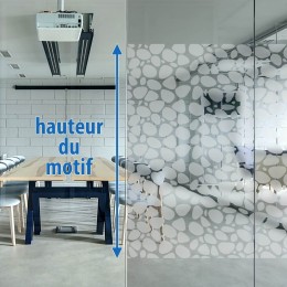 Conseil : le dessin du film adhésif depoli 'Galets et Pierres' étant réalisé sur la hauteur du film (152cm), adaptation parfaite sur tout vitrage inférieure ou égale à cette dimension. Pas de raccord possible pour dimension supérieure à 152cm.