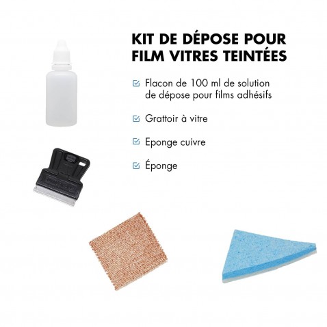 - Flacon de 100 ml de solution de dépose pour films adhésifs : solution spécifique pour enlever le film solaire de la vitre.