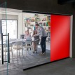 Adhésif opacifiant rouge à appliquer sur surface vitrée.