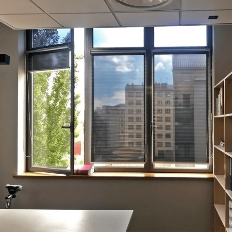 - - Store occultant baissé de jour : Le store protège de la chaleur et de l'éblouissement, tout en conservant la visibilité à travers la fenêtre depuis l'intérieur. Toutefois, la vue depuis l'extérieur est occultée grâce à l'effet miroitant du store.