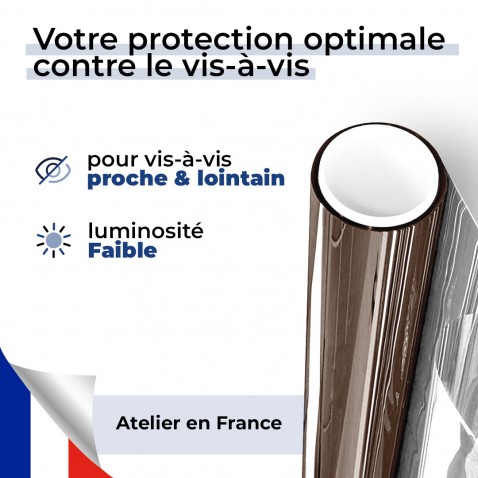 Film miroir sans tain réfléchissant Bronze. Le balancement de la lumière garantit un effet miroir sans tain si la source de lumière est plus forte à l'extérieur qu'à l'intérieur de votre pièce dans laquelle vous voulez vous protéger des regards indiscrets.