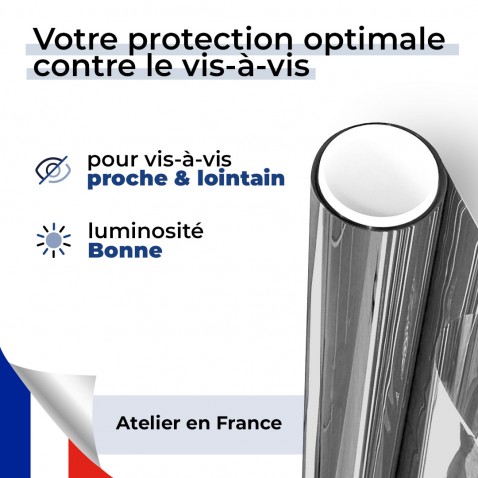 Film adhésif miroir sans tain pour lutter contre les regards indiscrets. Véritable barrière contre les regards indésirables à proximité immédiate de la vitre (1 mètre environ). Avec 77% de rejet d'énergie solaire, ce film adhésif est également très efficace contre les chaleurs estivales.
