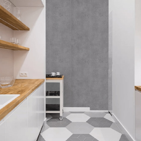 Tout en offrant un résultat visuel identique à une rénovation traditionnelle (peinture, tapisserie, ...), l'application d'un vinyle autocollant Pierre Béton Foncé possède de nombreux avantages :