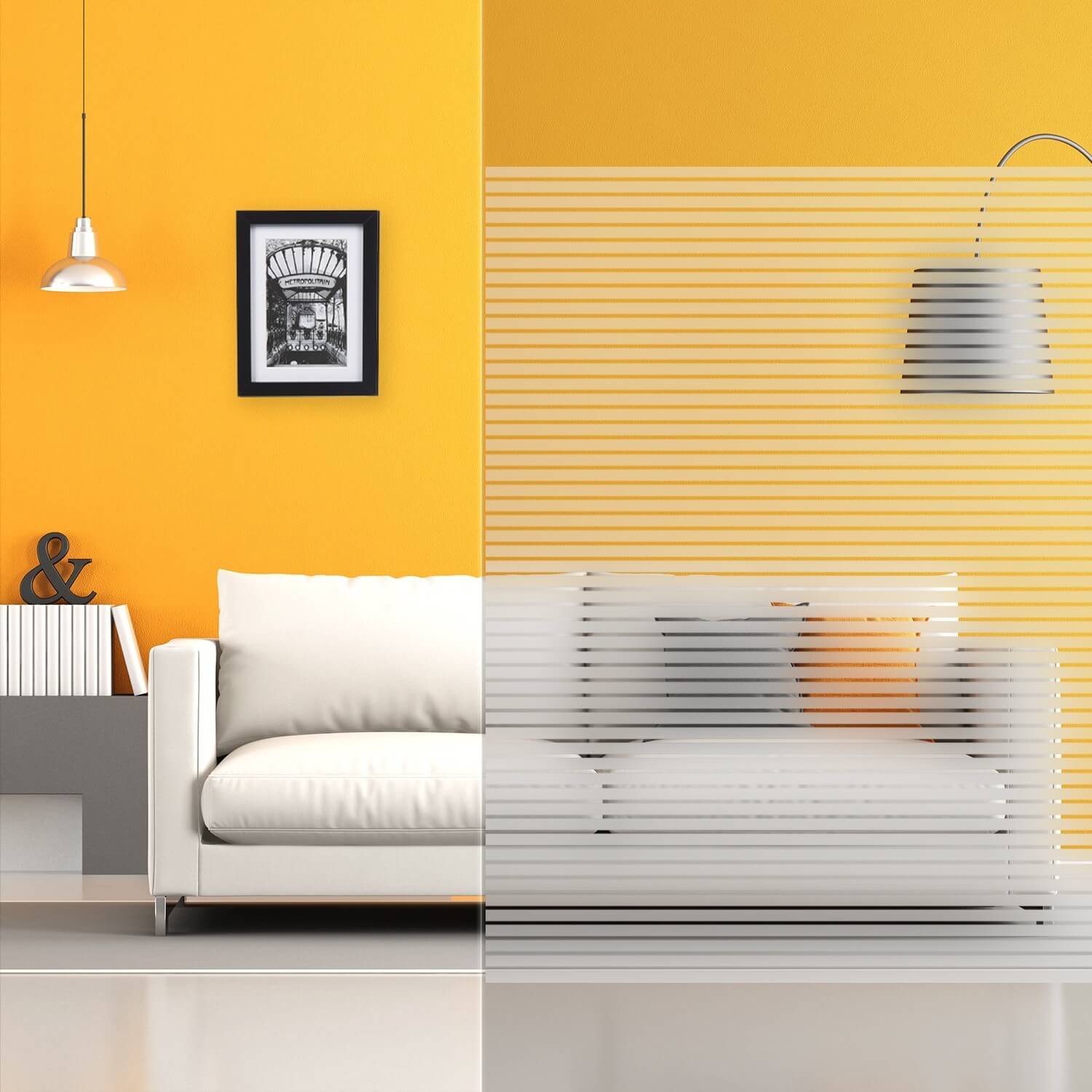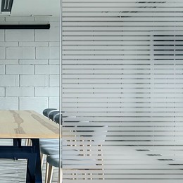 Film déco vitrage à bandes horizontales dépolies 18 mm espacés chacune de 6 mm.