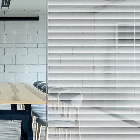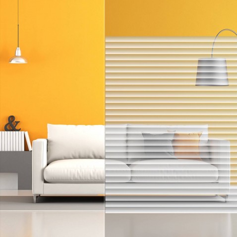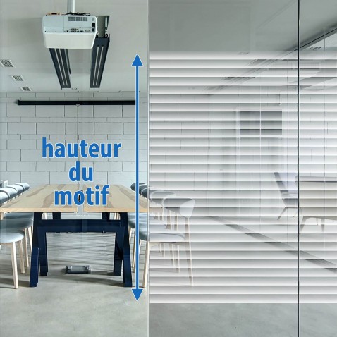 les bandes tramées du film décoratif aspect micro perforé étant imprimées sur la hauteur du film (152cm), adaptation parfaite sur tout vitrage inférieure ou égale à cette dimension.