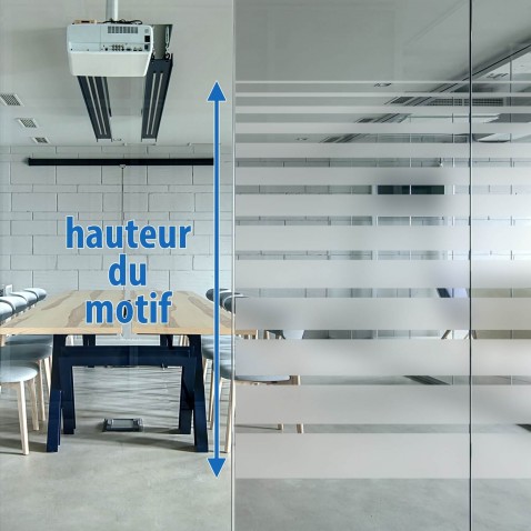 Conseil : les bandes du film décoration intimité à bandes dégradées étant imprimées sur la hauteur du film (152cm), adaptation parfaite sur tout vitrage inférieure ou égale à cette dimension.