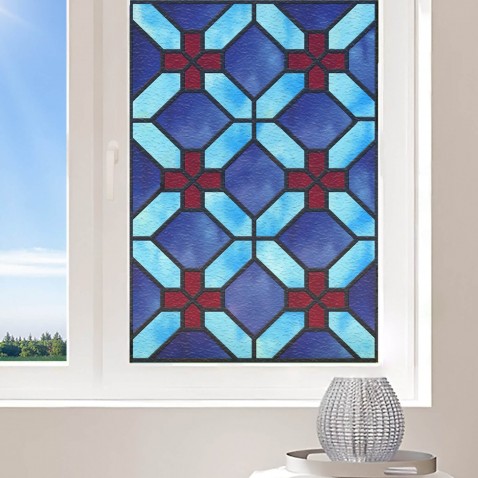 Film décoratif electrostatique à Croisillons bleus et rouges pour vitrage et fenetres.
