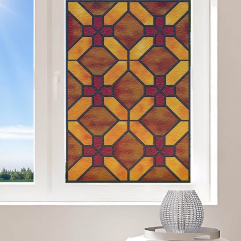 Film décoratif electrostatique à Croisillons jaunes, marron et rouges pour vitrage et fenetres.