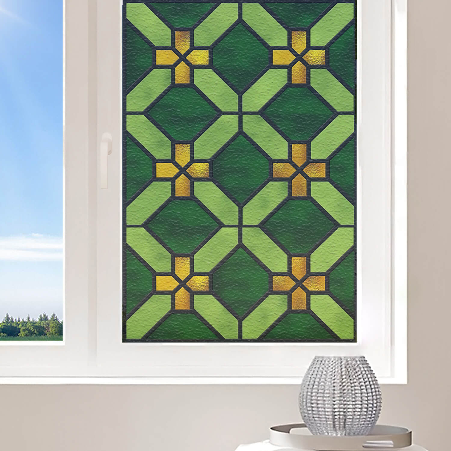 Film décoratif electrostatique à Croisillons jaunes et verts pour vitrage et fenetres.