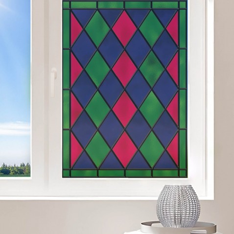 Film décoratif electrostatique à losanges bleus, verts et rouges pour vitrage et fenetres.