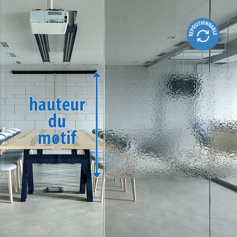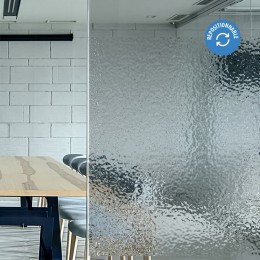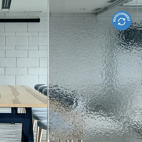 Film repositionable décoratif qui empêche la perception à travers le vitrage. Cet effet goutte d'eau qui se retranscrit par cette texture atypique laisse place à la lumière naturelle en rendant impossible la distinction claire et nette de l'intérieur.