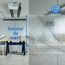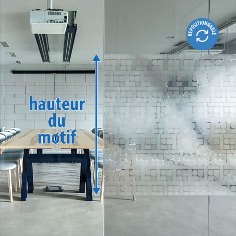 Ce film électrostatique permet un jeu de transparence entre formes géométriques dépolies qui empêche la vision à travers et un fond transparent qui laisse apparaître partiellement avec un effet flouté quelques détails.