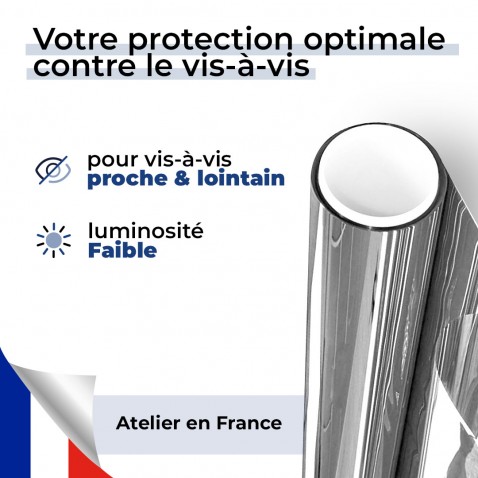 Cette propriété miroir sans tain fonctionne grâce à un jeu de lumières. L’effet miroir se produit donc du côté le plus lumineux du film. En journée, l'effet miroir protège donc des regards depuis l'extérieur. Toutefois, dès la nuit tombée et votre pièce intérieure éclairée, l'effet miroir s'inverse. Pour obtenir le maximum de la capacité de votre film pour votre pièce il faudra que toutes les fenêtres soient équipées du film.