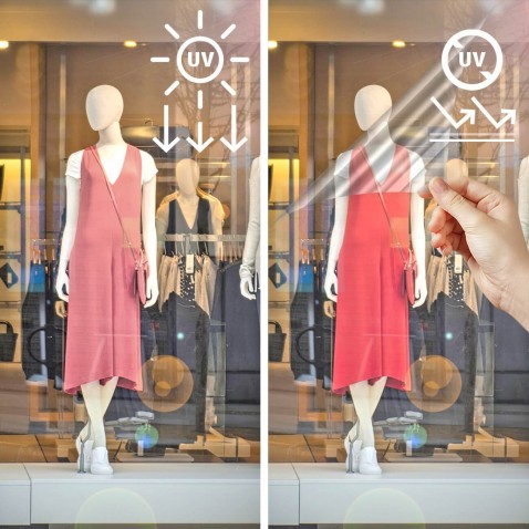 NB : Intégrez bien qu'un film anti-UV est en réalité un retardateur de décoloration. Certains articles en matière possédant une teinte mal stabilisée risquent tout de même la décoloration. Malgré la filtration des UV par un film anti-UV, la lumière visible et la chaleur peuvent générer la décoloration des articles. Si la vitre est elle-même source de chaleur par son exposition, nous recommandons l'utilisation d'un film anti-UV anti chaleur.