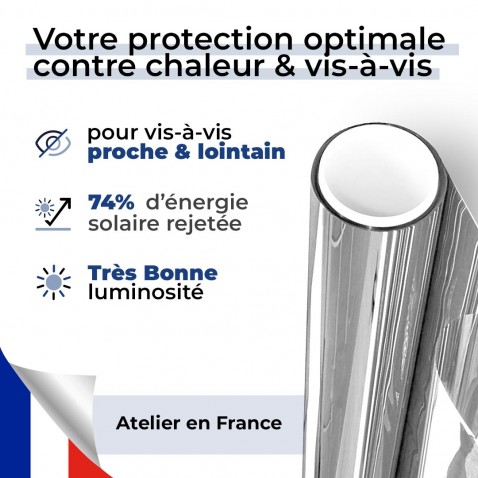 Film 2 en 1 anti-chaleur et anti vis-à-vis pour pose extérieure – Argent clair – Haute durabilité Film anti-chaleur et film anti-regard en même temps. Ce film pour vitre sera idéal pour retrouver son intimité et une fraîcheur chez vous au quotidien. Le film pour vitrage 2 en 1 offre une solution pour réduire sa consommation d’énergie.