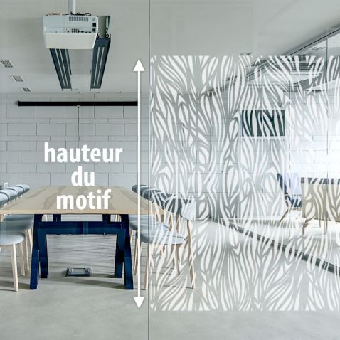 Conseil : le dessin du film adhésif dépoli Aquatique étant réalisé sur la hauteur du film (152cm), l'adaptation sera parfaite sur tout vitrage inférieure ou égale à cette dimension ou si vous souhaitez avoir une simple bande sur votre vitrage. Il n'y a pas de raccord possible pour une dimension supérieure à 152cm.