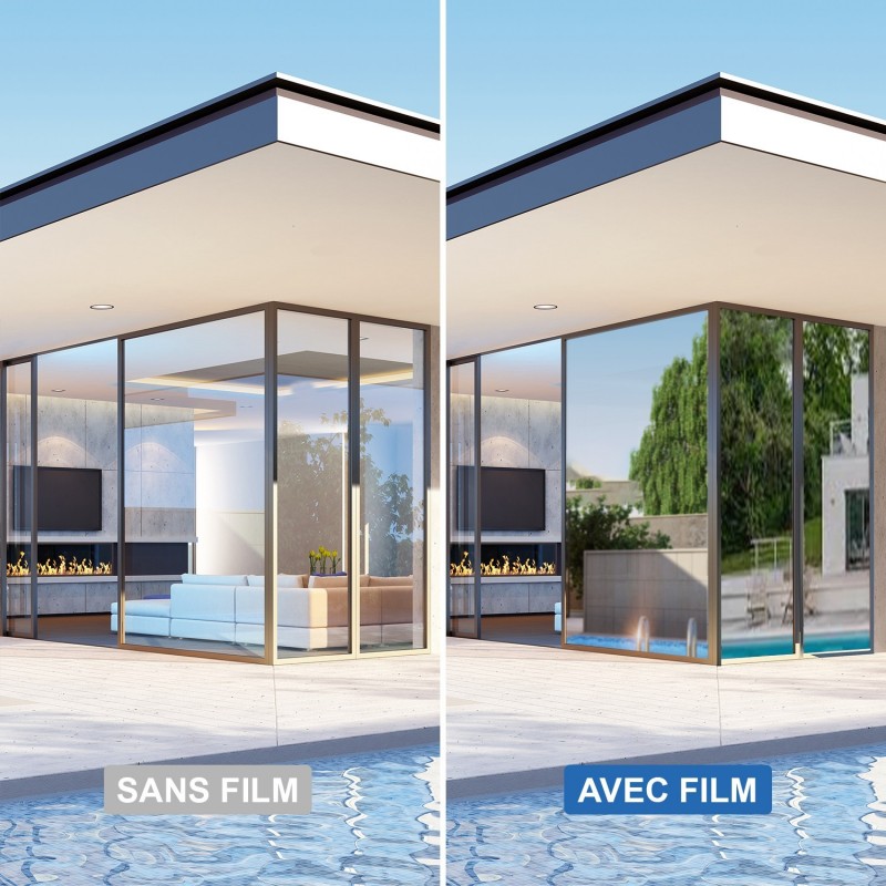 L’effet miroir sans tain sur un film permet de voir sans être vu, grâce à un côté miroir et un côté semi-transparent. Cet effet miroir se produit du côté le plus lumineux du vitrage, grâce à un jeu de balance des lumières. Il n’y a donc aucun côté miroitant prédéfini. Il s’agit seulement d’une composition faite de différents alliages, permettant de refléter la lumière et donc de protéger des regards. L’effet miroir est donc du côté extérieur du vitrage en journée et du côté intérieur du vitrage, dès la nuit tombée et les lumières intérieures éclairées.